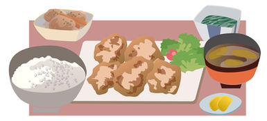 から揚げ・小鉢2品・ごはん・みそ汁・漬物